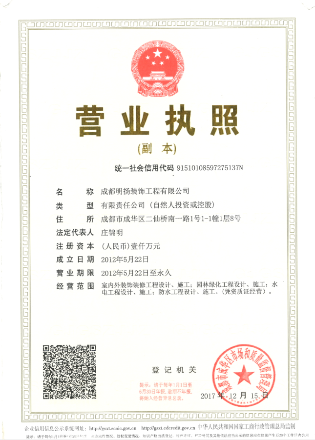 成都明揚(yáng)裝飾工程有限公司成立于2012年05月22日,公司注冊(cè)資本1000萬(wàn)元,旗下品牌包括“明揚(yáng)裝飾”、“瑞明揚(yáng)裝飾”,主營(yíng)業(yè)務(wù)涵蓋餐飲空間、商鋪、酒店、辦公室、寫字樓、教育培訓(xùn)、奶茶飲品、美容美發(fā)及廠房等裝飾裝修相關(guān)的所有業(yè)務(wù)。公司持二級(jí)裝飾裝修工程資質(zhì),成立至今裝修落地大中型工裝100多家,中小型更甚,涉及餐飲、酒店、空間、教育、裝修等,其中不乏業(yè)內(nèi)前列的優(yōu)秀作品。公司人員配置充足穩(wěn)定,集設(shè)計(jì)施工售后一體,含設(shè)計(jì)師,項(xiàng)目經(jīng)理、施工員、監(jiān)理、材料員、資料員、財(cái)務(wù)、人事、采購(gòu)等,施工隊(duì)伍擁有多套固定班組,能同時(shí)多家工地進(jìn)行設(shè)計(jì)和施工,擁有一套多年成熟嚴(yán)格的施工工藝標(biāo)準(zhǔn),通過項(xiàng)目現(xiàn)場(chǎng)施工總結(jié)和對(duì)比,能夠在不同的施工環(huán)境下使作品圓滿落地。