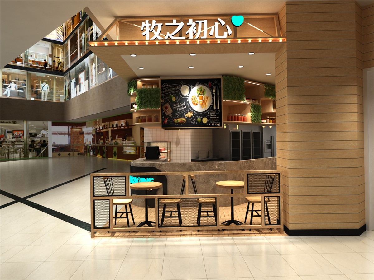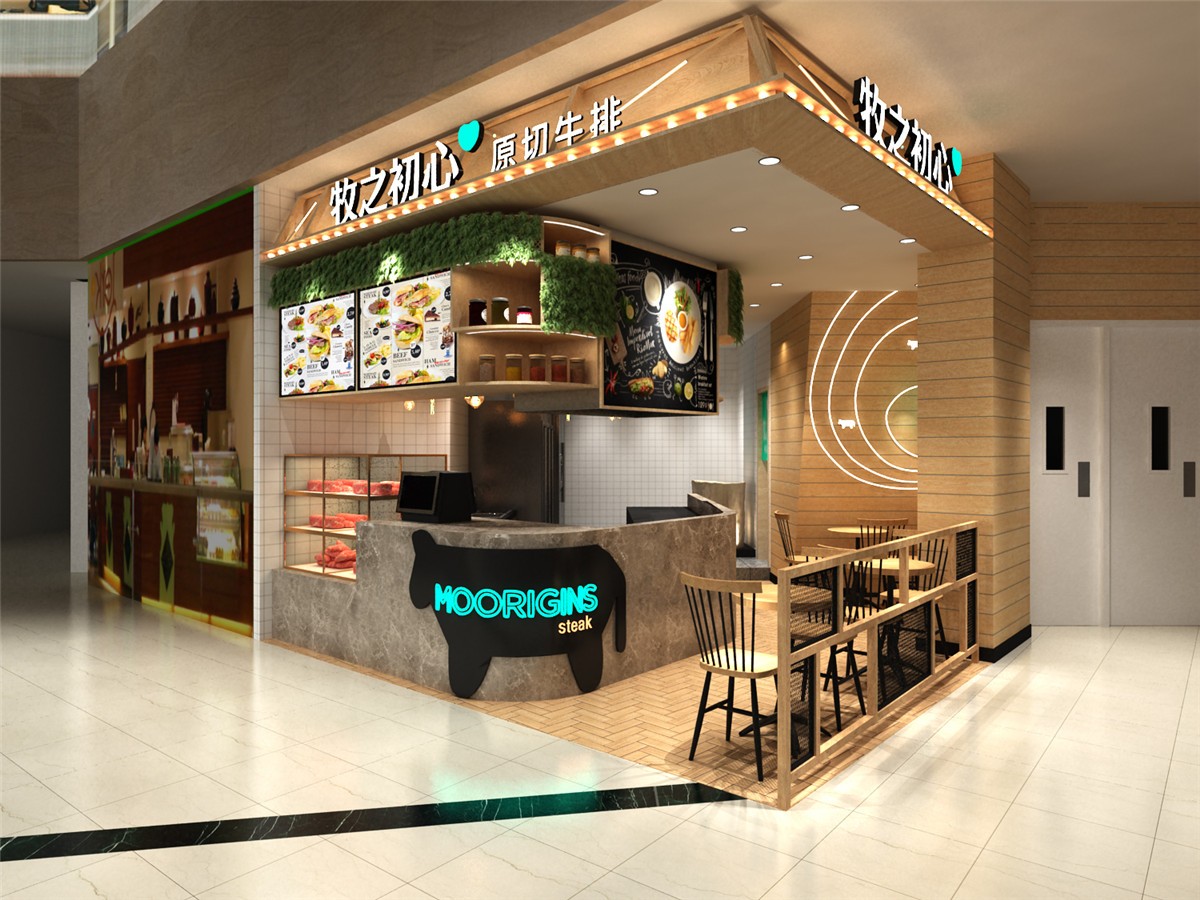 案例介紹:商場(chǎng)小餐飲店鋪,牧之初心牛排連鎖店,以原木色為主色調(diào),打造自然北歐風(fēng)情。