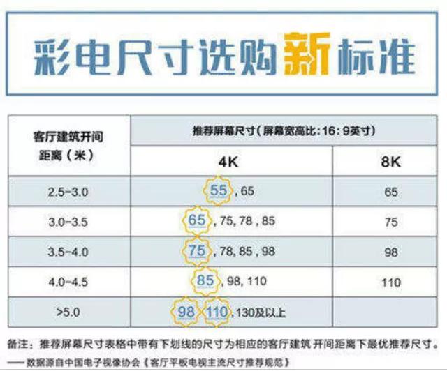 3.5--4米觀看距離 : 75--85寸,8K電視 : 85--98寸。