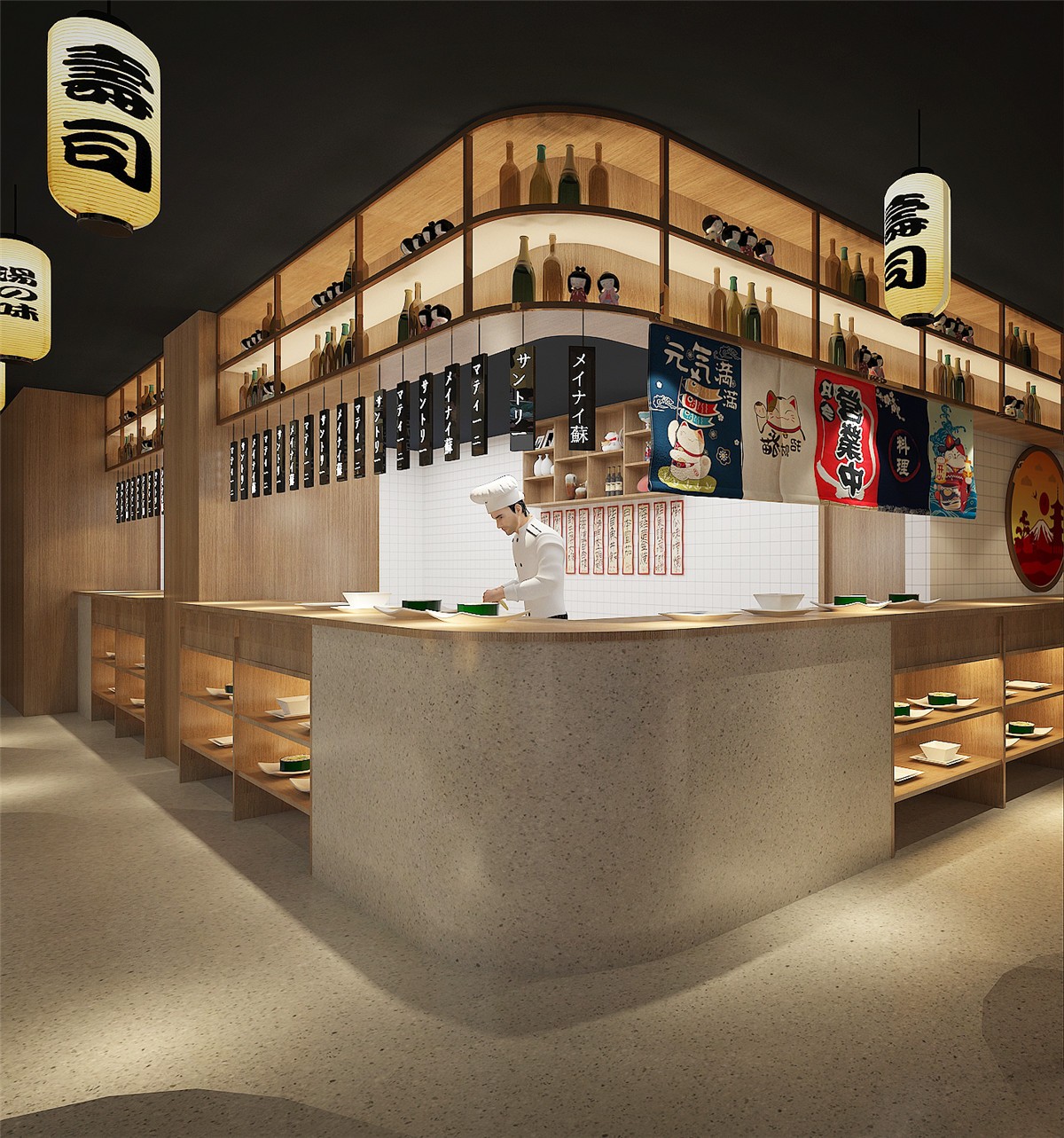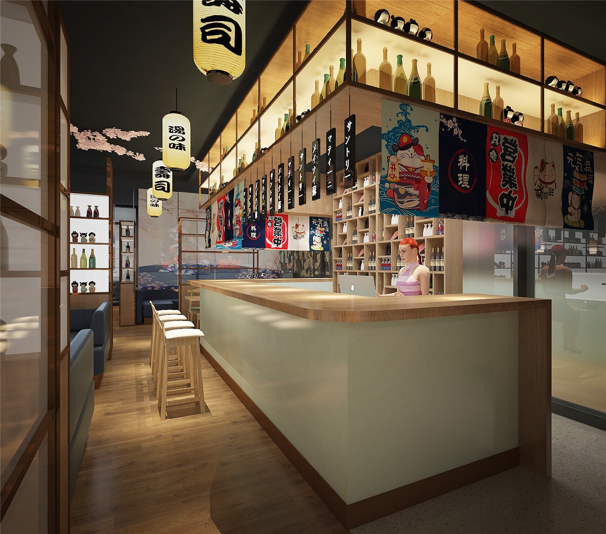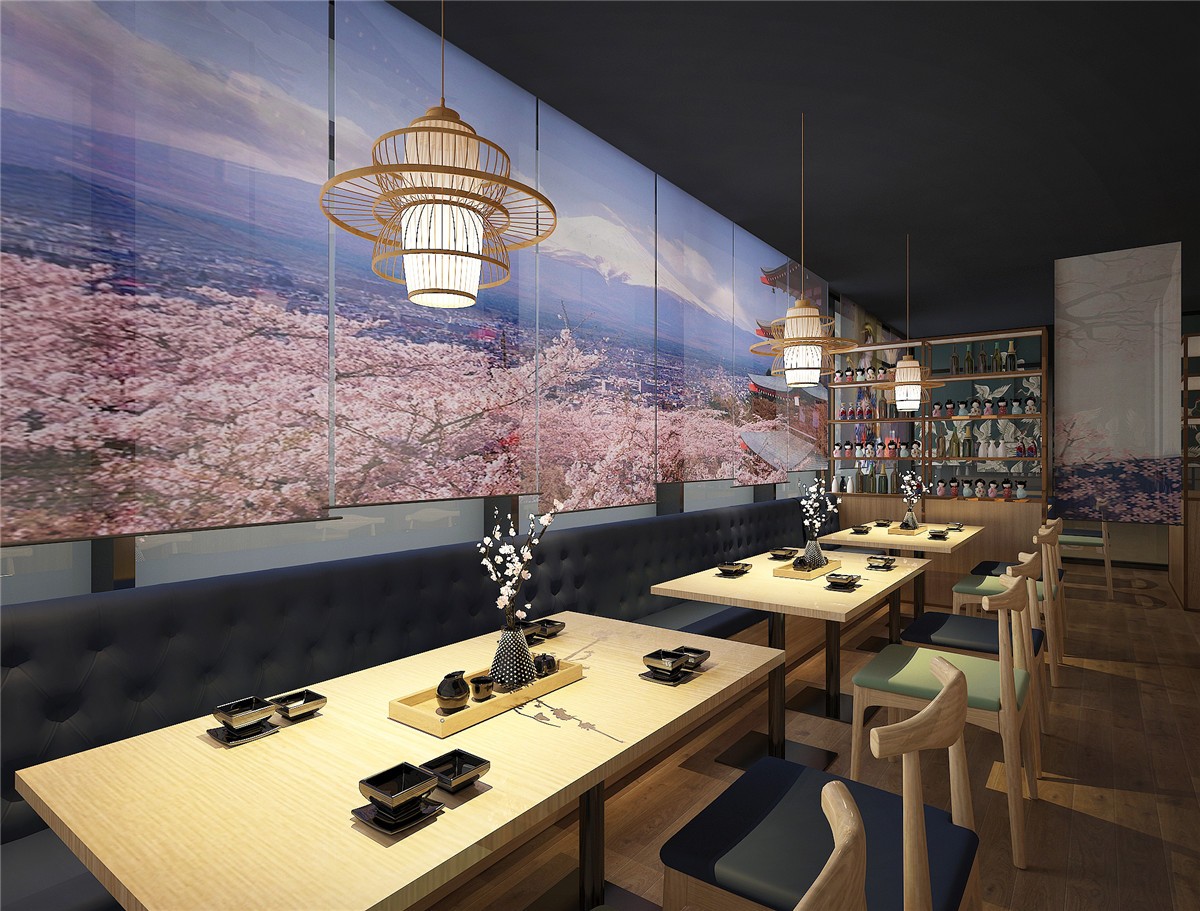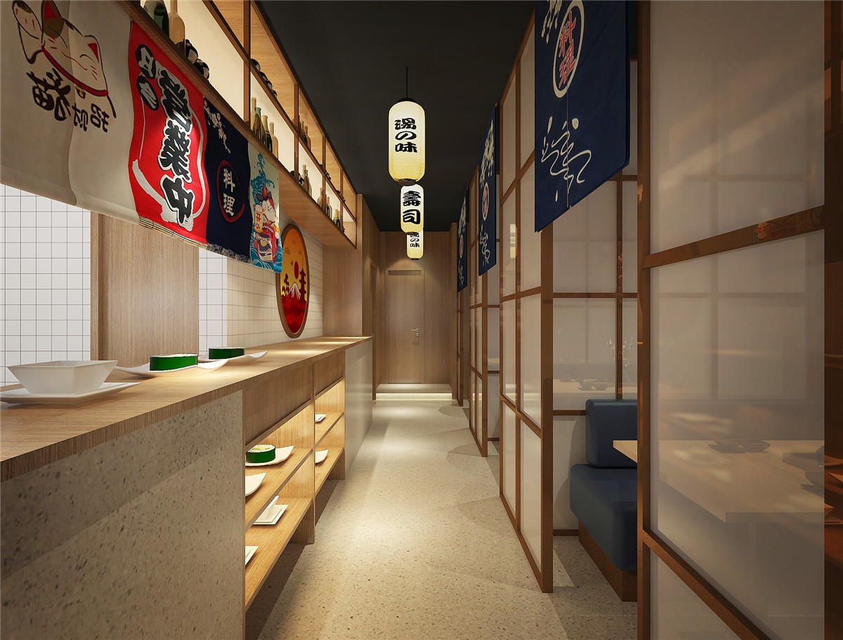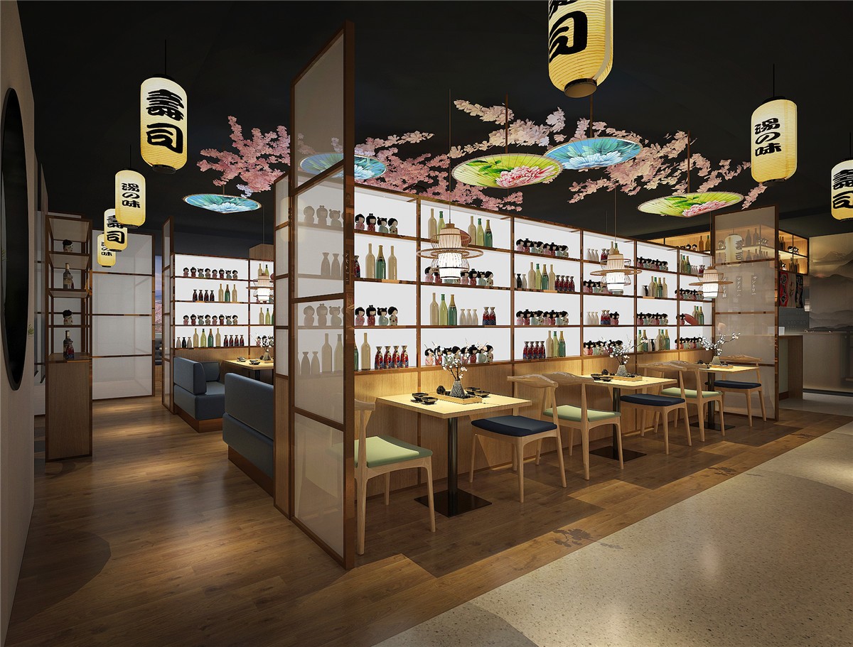 案例介紹:日本料理店,中式與日本元素相結(jié)合的設(shè)計風(fēng)格,項目從設(shè)計到施工到落地歷時75天。色調(diào)以原木色為主,輔色結(jié)合日本本土特色元素,項目在不失日本文化的同時兼容中國特色。